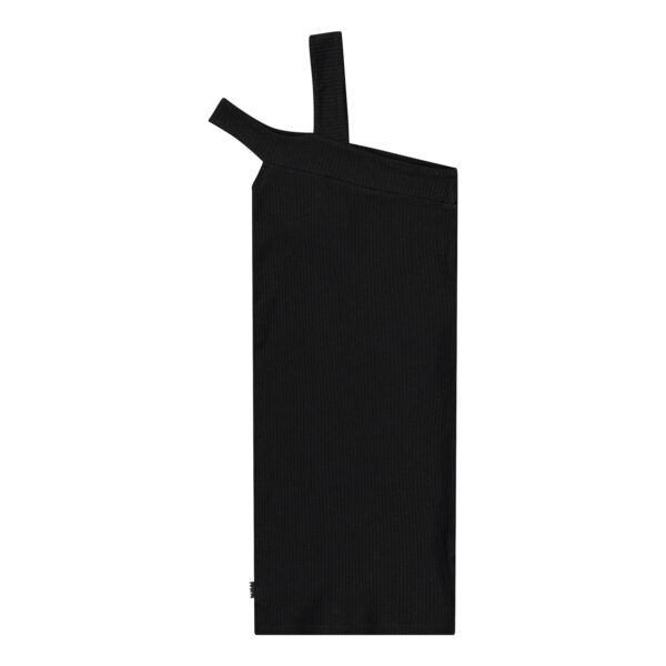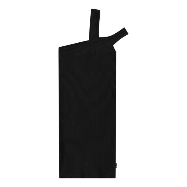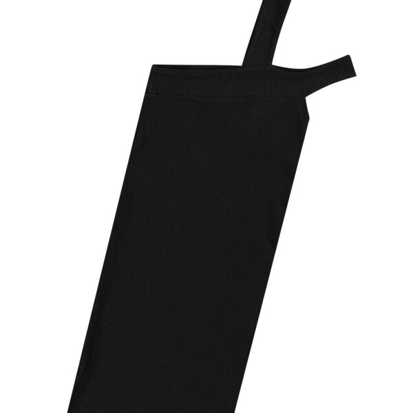 Descrizione: Abito nero al ginocchio con spalline sottili in morbida viscosa elasticizzata a coste. L’abito ha una linea aderente con due spalline sulla spalla sinistra, una che sale sopra la spalla e l’altra che scende sopra la spalla.