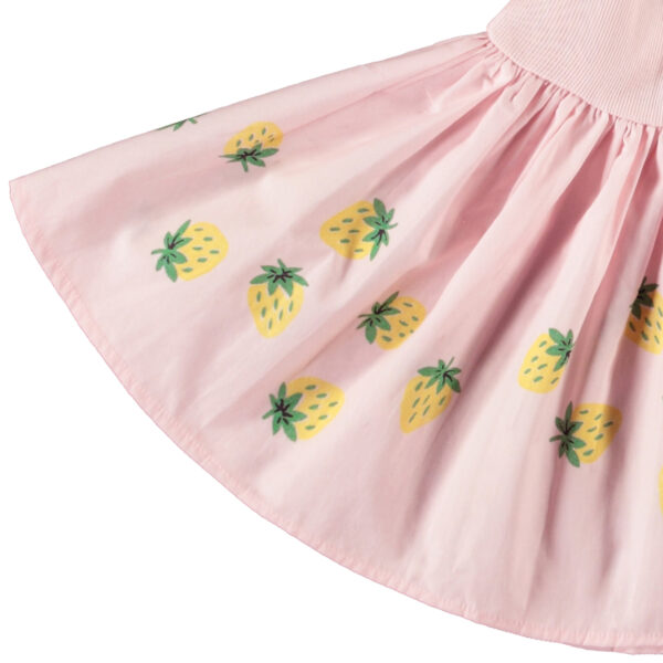 Descrizione:  Vestito per i più piccoli in cotone biologico. L’abito è rosa con una stampa di fragole gialle sulla gonna. Il top è aderente in jersey a coste, mentre la gonna è in popeline, che dona volume all’abito. È facile da indossare e comodo da indossare.