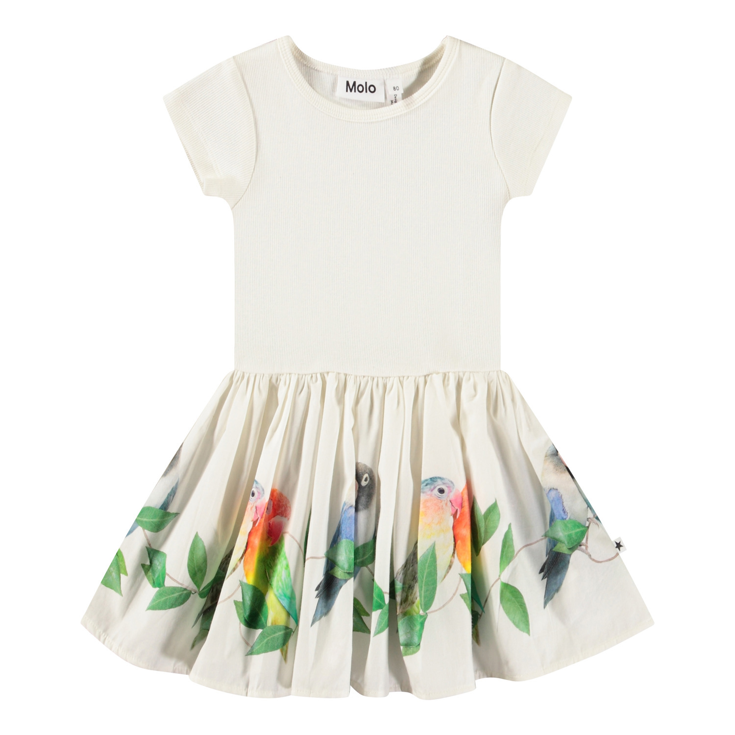 Descrizione: Vestito per i più piccoli in cotone biologico. L’abito è bianco con una stampa di piccoli pappagalli sulla gonna. Il top è aderente in jersey a coste, mentre la gonna è in popeline, che conferisce volume all’abito. È facile da indossare e comodo da indossare.