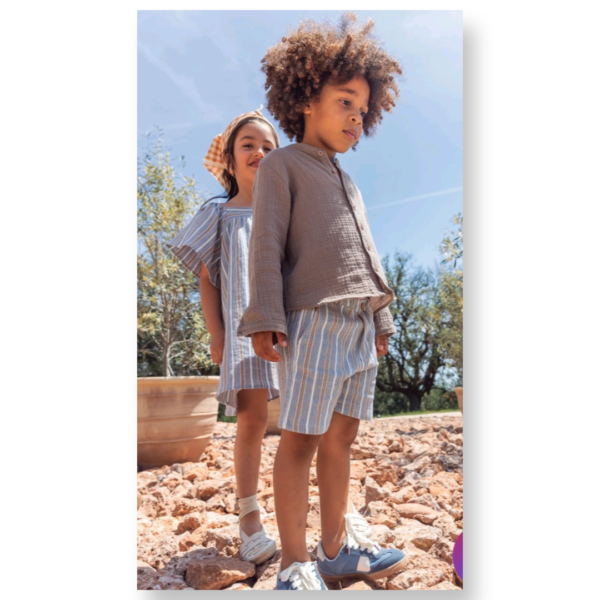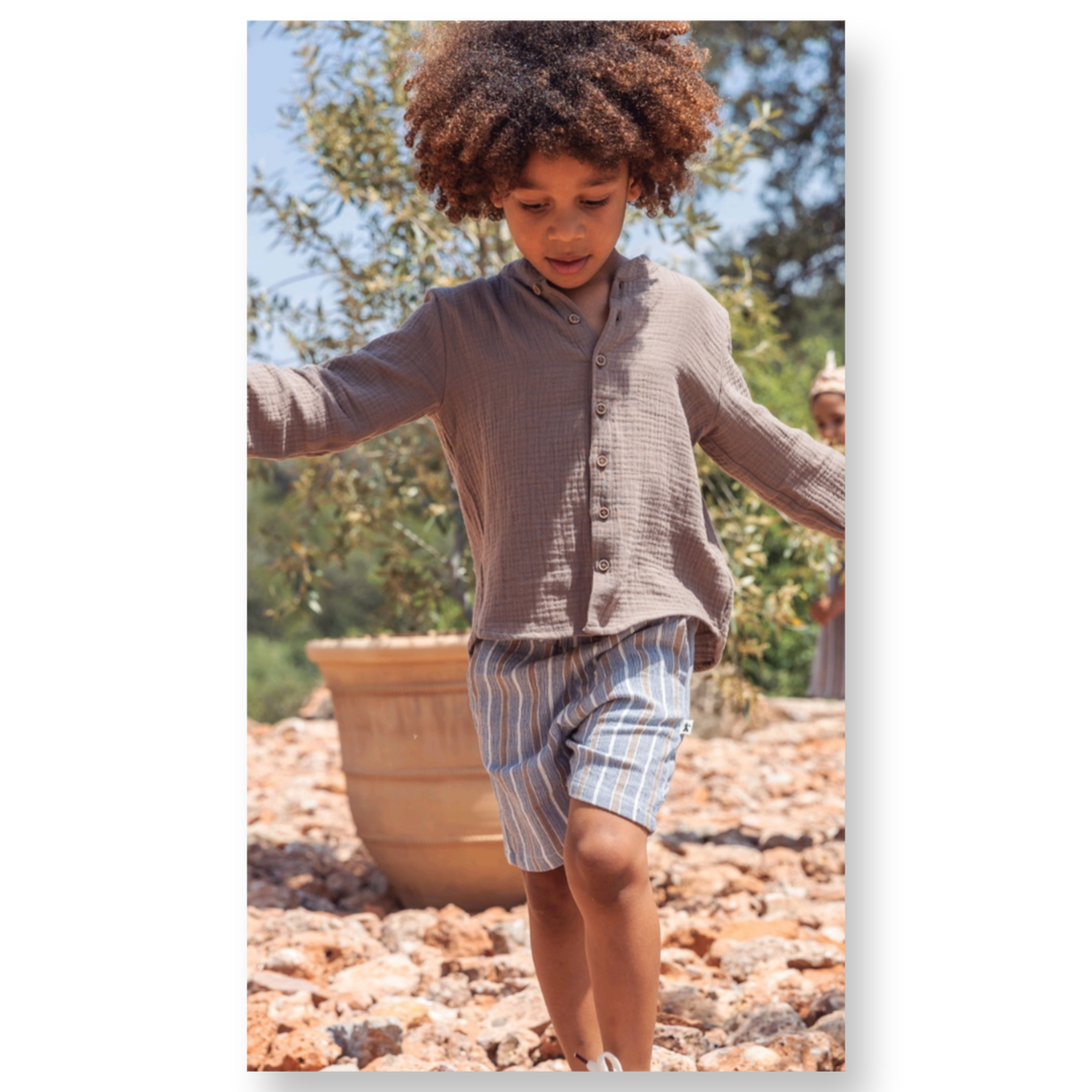 Descrizione: Bermuda a righe bianche, blu e caffè. Elastico in vita. Abbinalo ad una camicia color caffè o bianca.