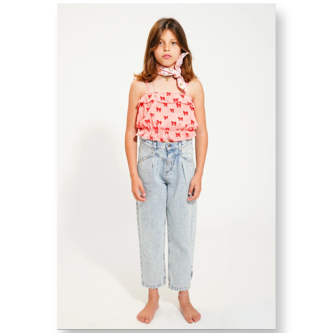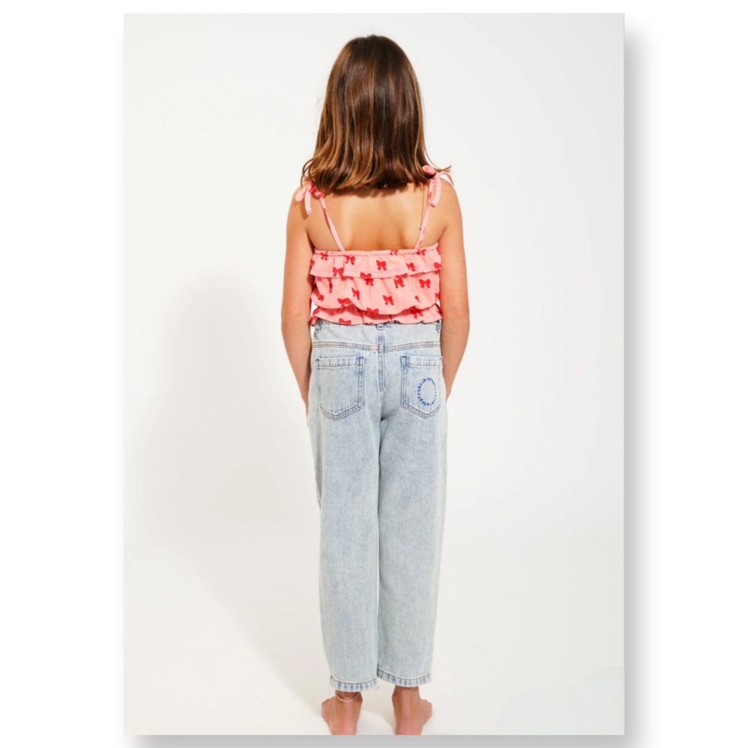 Descrizione:  Pantaloni Mom Fit con vita regolabile, scapolare e pinces anteriori. Dettagli logo