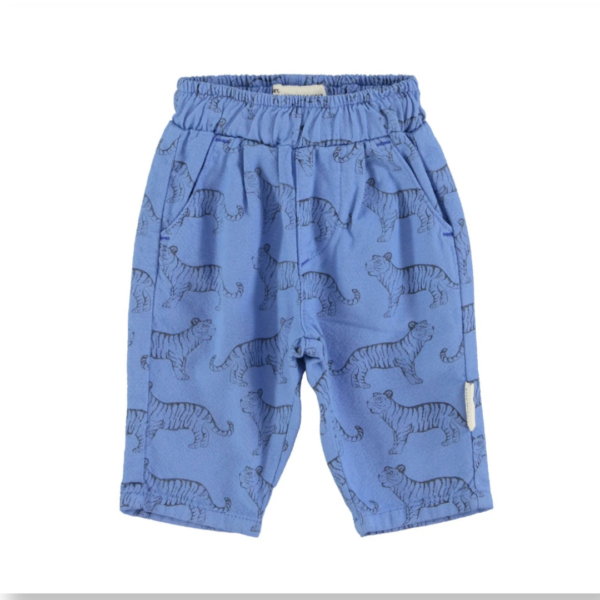 Descrizione:  Pantaloni per neonati unisex blu con tigre nere. Elastico in vita e tasche laterali.