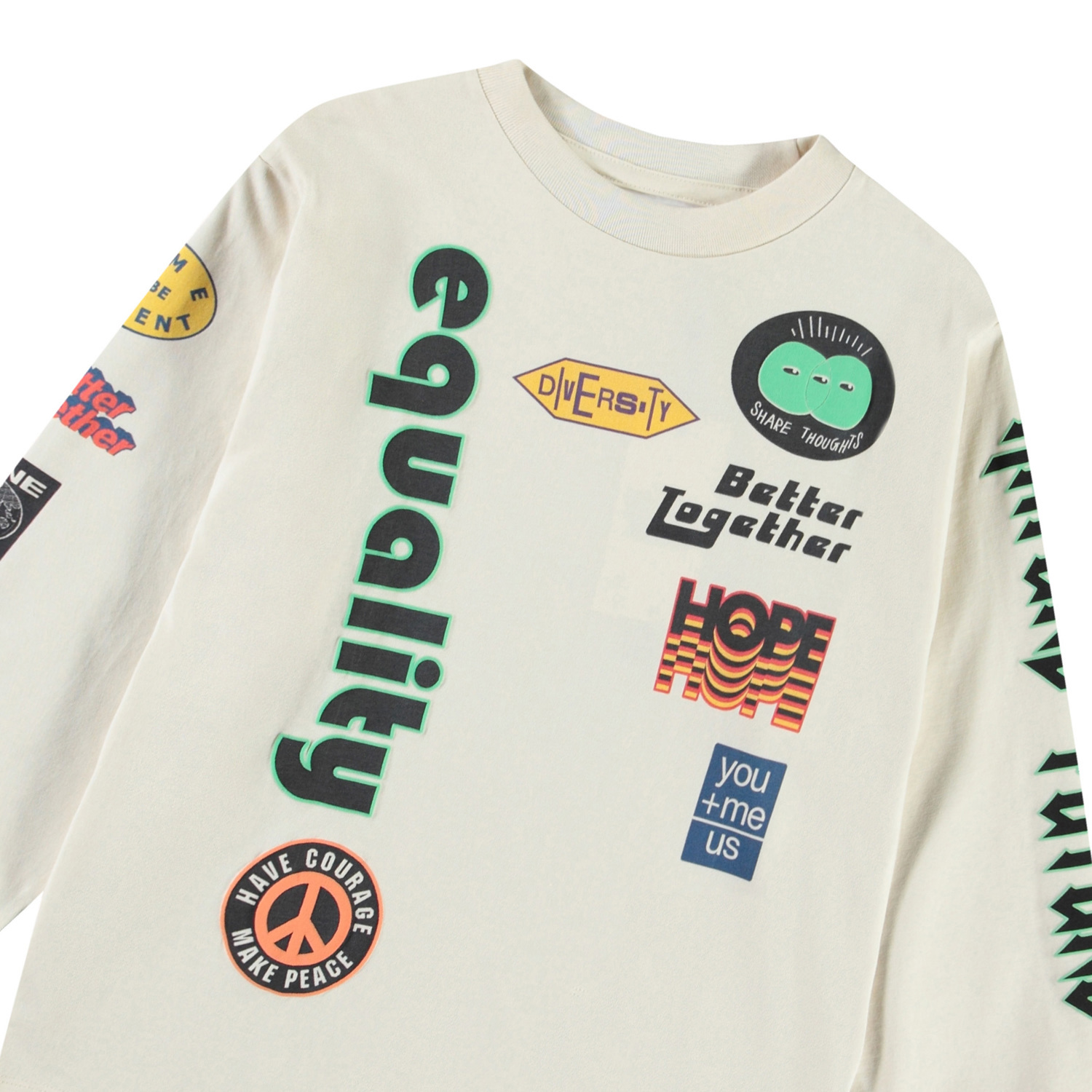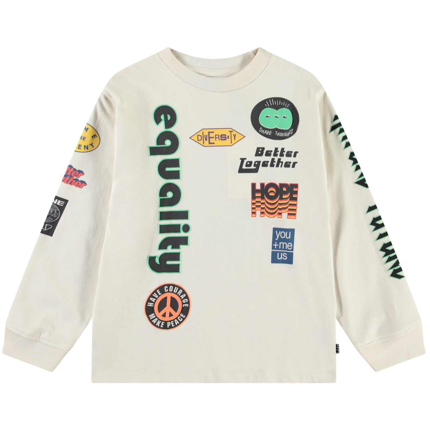 Descrizione:  Maglia a maniche lunghe bianco sporco in cotone biologico con bordo a coste su scollo e maniche. Il top ha una vestibilità ampia e piccole stampe di riferimenti positivi al motocross.